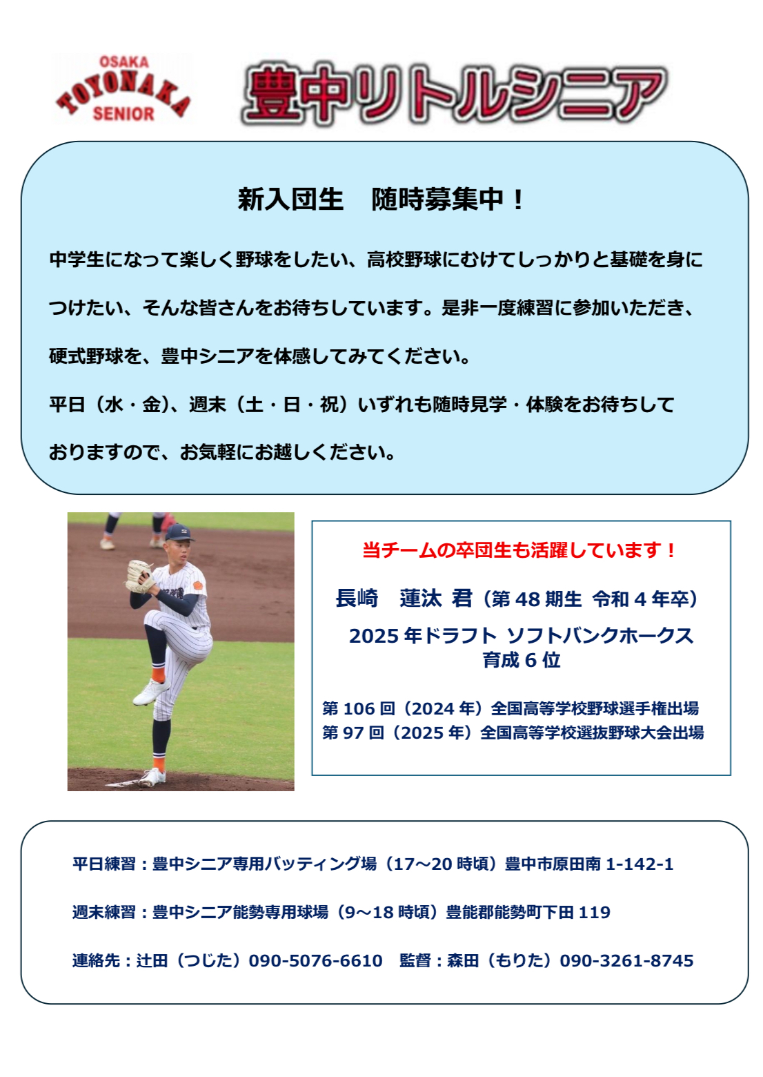 豊中リトルシニアでは、年間を通じて中学一年生、新中学一年生